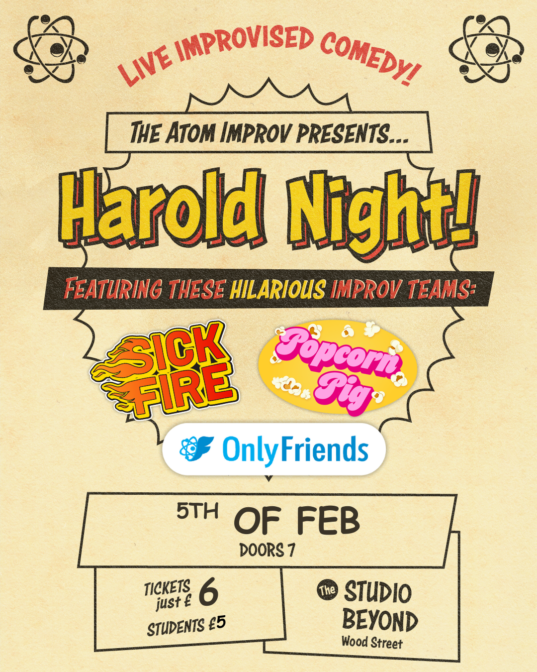 Harold Night Thursday, February 5, 2026 7:15 PM 8:15 PM The Studio Beyond 63 Wood Street Liverpool, England, L1 4AL United Kingdom (map) Google Calendar ICS Join The Atom Improv for a night of hilarious long-form improv comedy at Liverpool's one and only Harold night! Our Harold teams will weave a show so funny you’ll think it was scripted! Every first and third Thursday of the month at Studio Beyond.£6 general, £5 students GET TICKETS Featured Atom Teams: Featured Popcorn Pig Only Friends Sick Fire